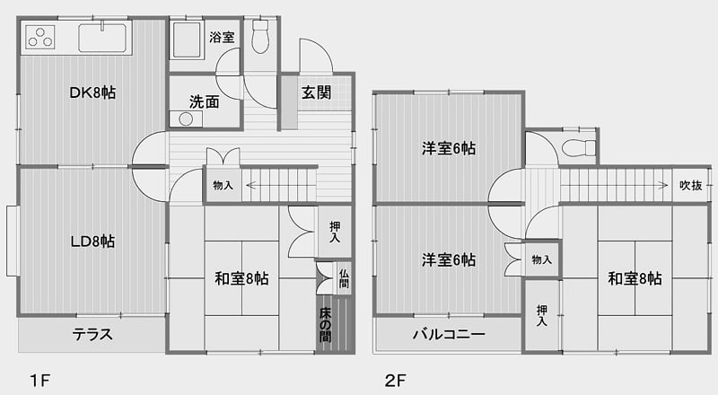 L8畳 1階 1室 DK8畳 1階 1室 和室8畳 1階 1室 洋室6畳 2階 2室 和室8畳 2階 1室 |