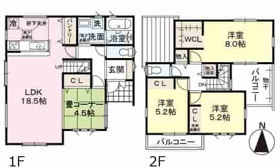 LDK18.5畳 1階 1室 和室4.5畳 1階 1室 洋室8畳 2階 1室 洋室5.2畳 2階 2室 |
